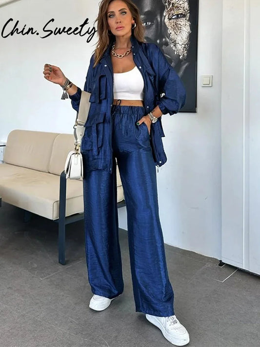 Set aus einfarbiger Utility-Jacke und Hose mit Kordelzug