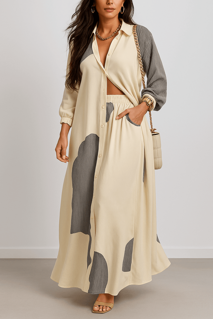 Oberteildetails: Langes, einreihiges Hemd mit Umlegekragen und handgelenklangen Ärmeln.