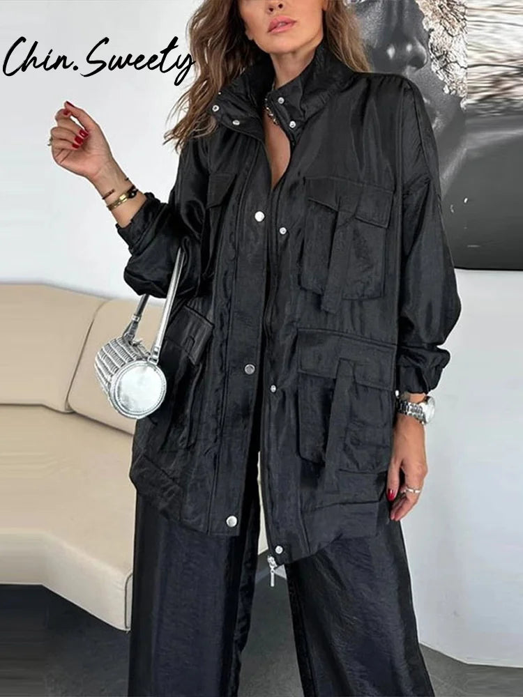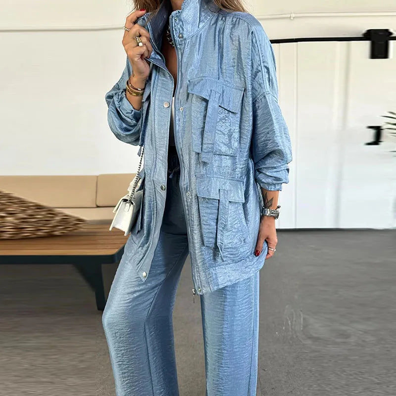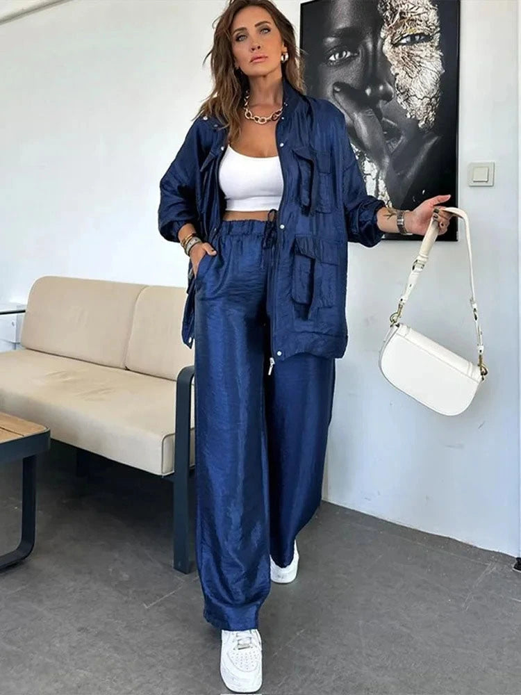 Eine Frau präsentiert einen stylischen Zweiteiler aus tiefblauem, satinartigem Stoff. Das Outfit besteht aus einer lässigen, langärmeligen Arbeitsjacke und einer dazu passenden, hoch taillierten Hose mit weitem Bein und Kordelzug. Dazu kombiniert sie ein weißes, kurzes Tanktop, weiße Sneakers, eine weiße Umhängetasche und Goldschmuck für einen mühelos schicken und eleganten Look.