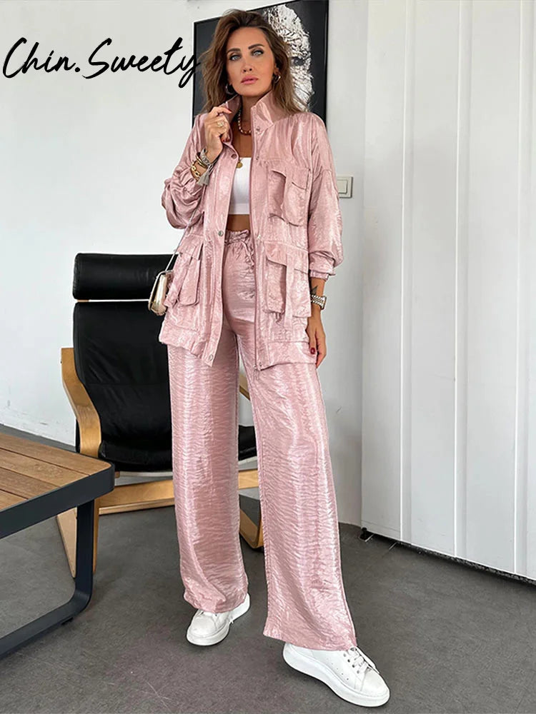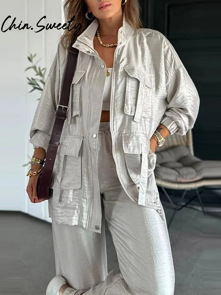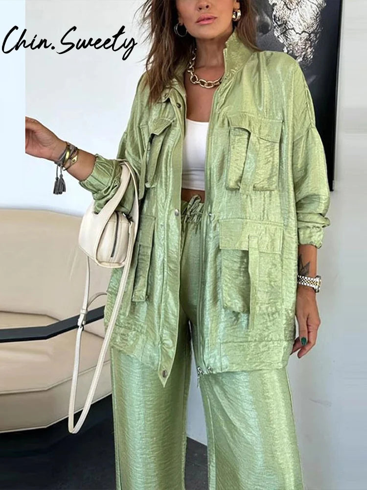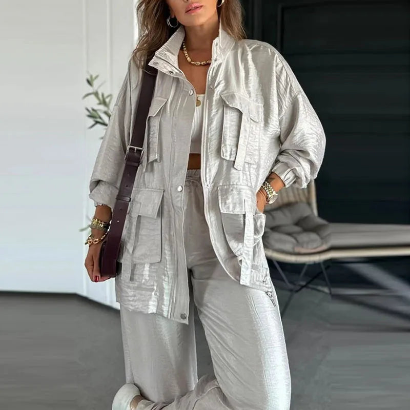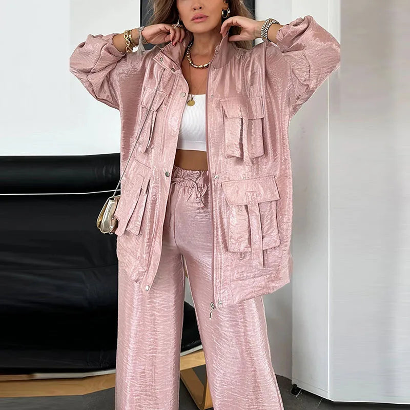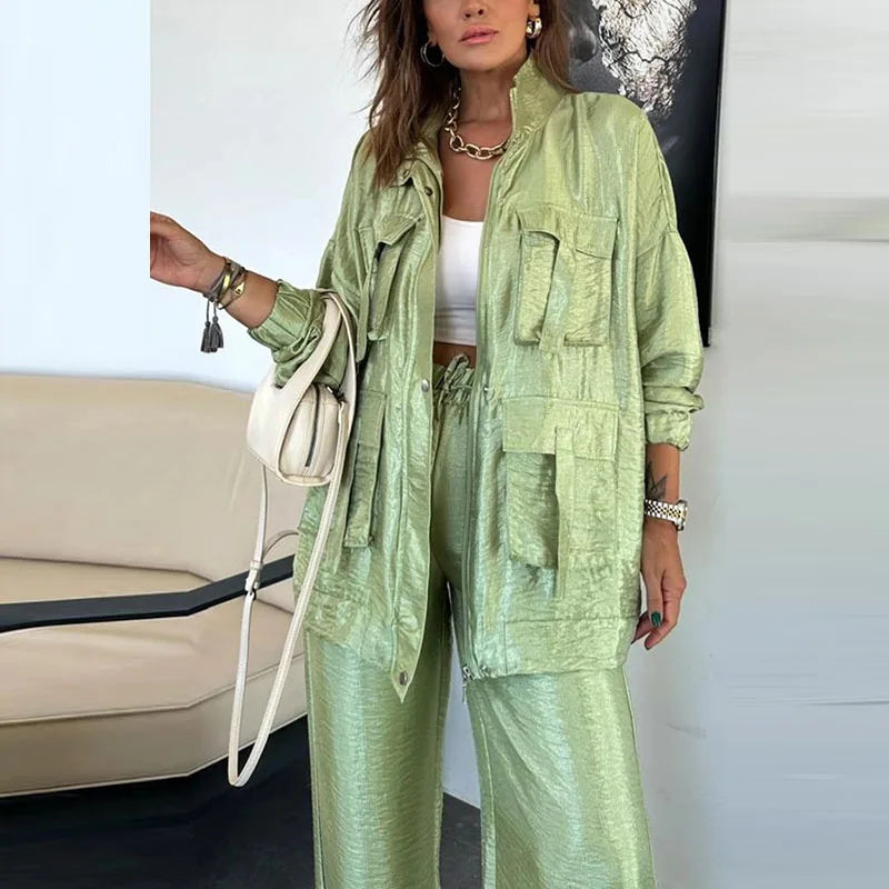 Set aus einfarbiger Utility-Jacke und Hose mit Kordelzug