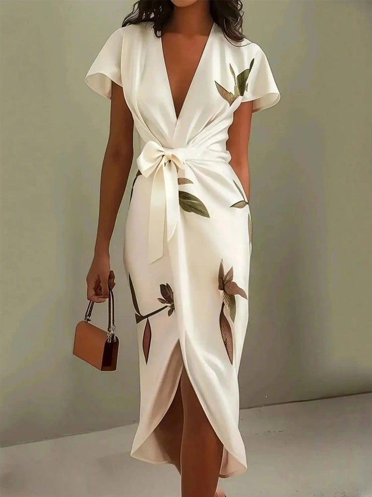 Der zarte Blätterdruck verleiht einen Hauch von verspieltem Charme und sorgt gleichzeitig für ein anmutiges Gesamtbild. Ob Sie eine formelle Veranstaltung oder ein stilvolles Abendessen besuchen, mit diesem Kleid machen Sie immer einen modischen Eindruck.