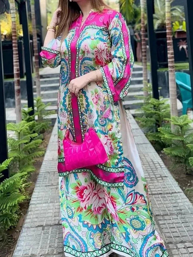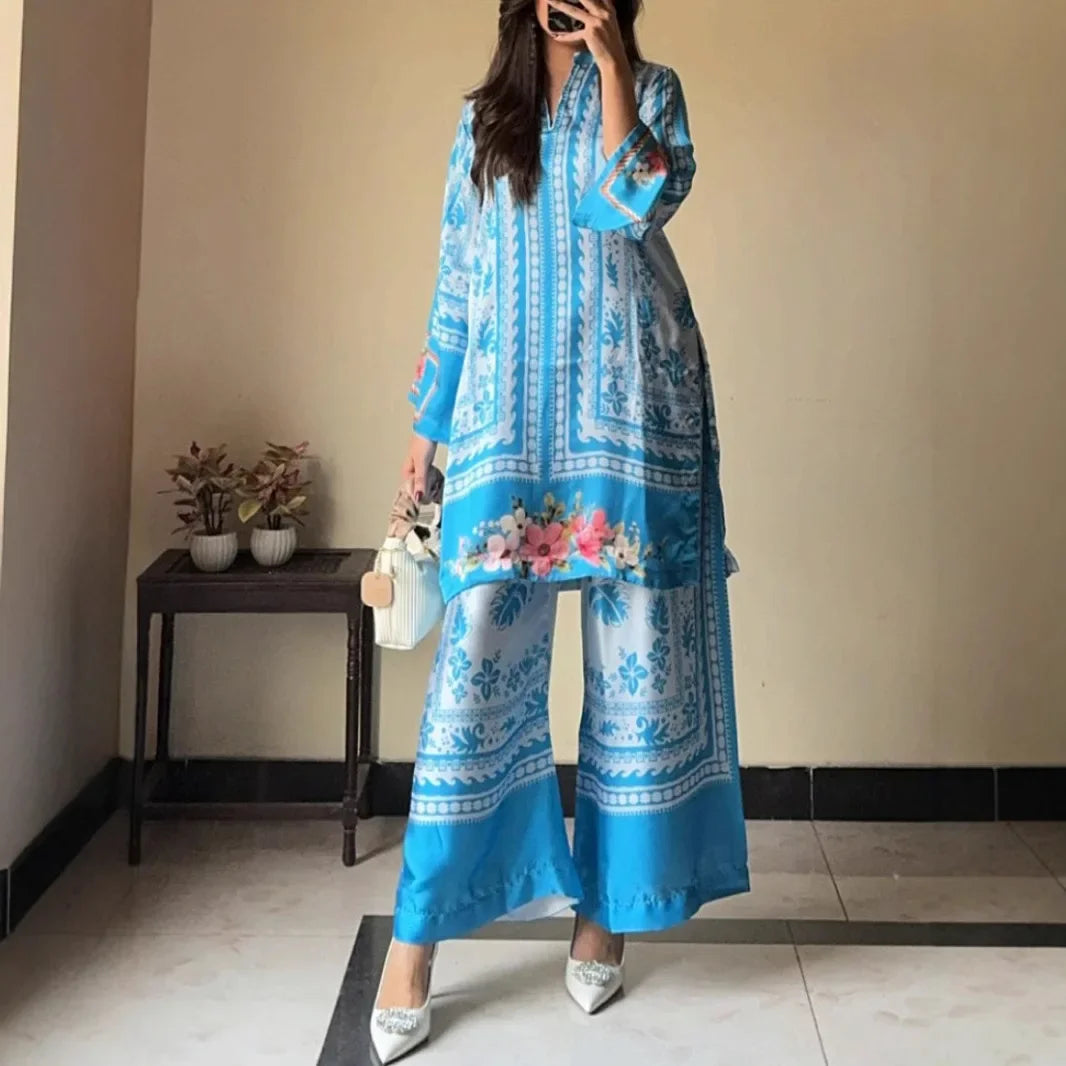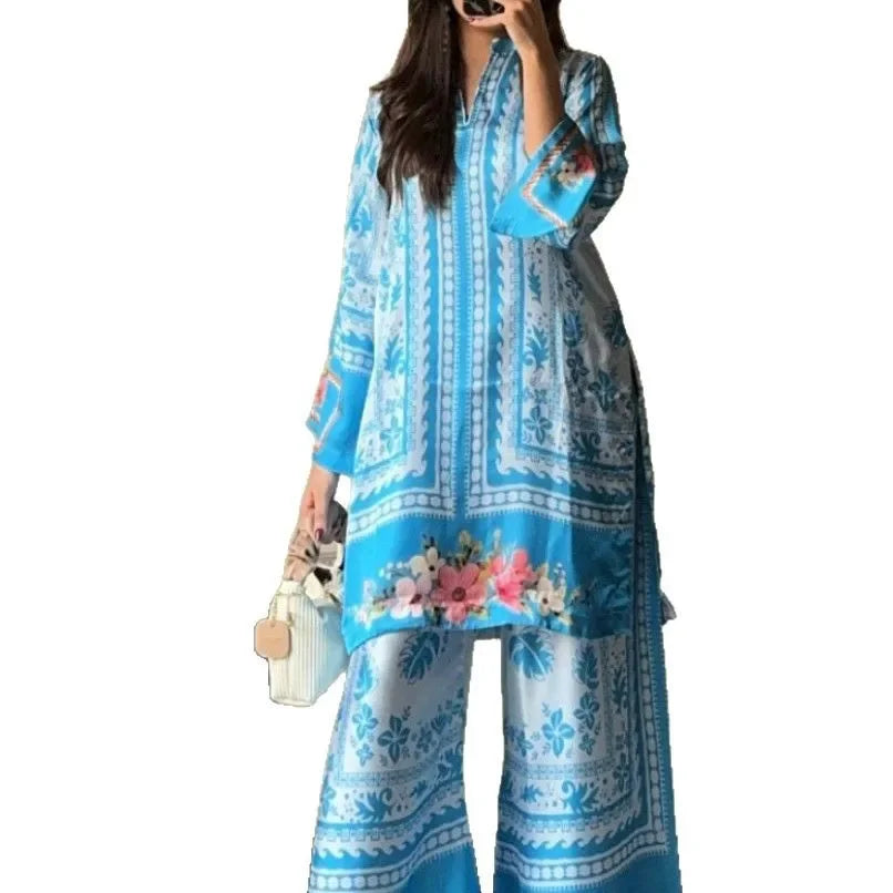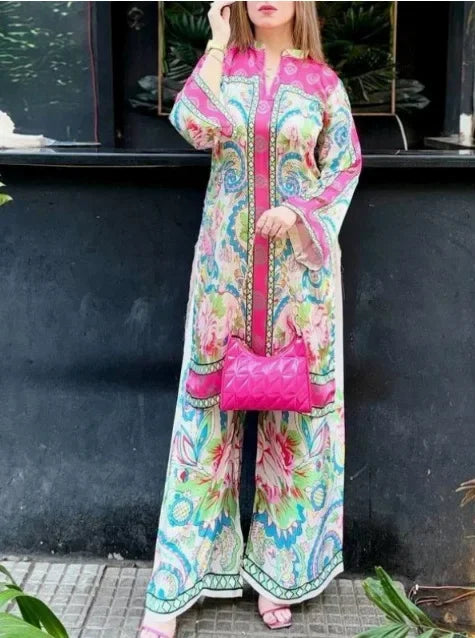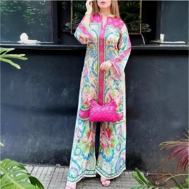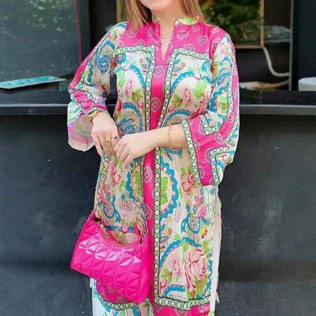 Umgeben Sie sich mit diesem wunderschön designten Langarm-Ensemble von einer Aura der Anmut. Die fließende Silhouette und das lebendige Muster erinnern an das reiche künstlerische Erbe Marokkos und machen es zur perfekten Wahl für entspannte Tage und besondere Anlässe. Das leichte Material bietet außergewöhnlichen Komfort und Atmungsaktivität – ideal für das warme marokkanische Klima. Das einzigartige Design und die bequeme Passform sorgen dafür, dass Sie sich überall elegant und wohl fühlen. Erleben Sie die Schönheit des marokkanischen Stils mit diesem bezaubernden Stück.