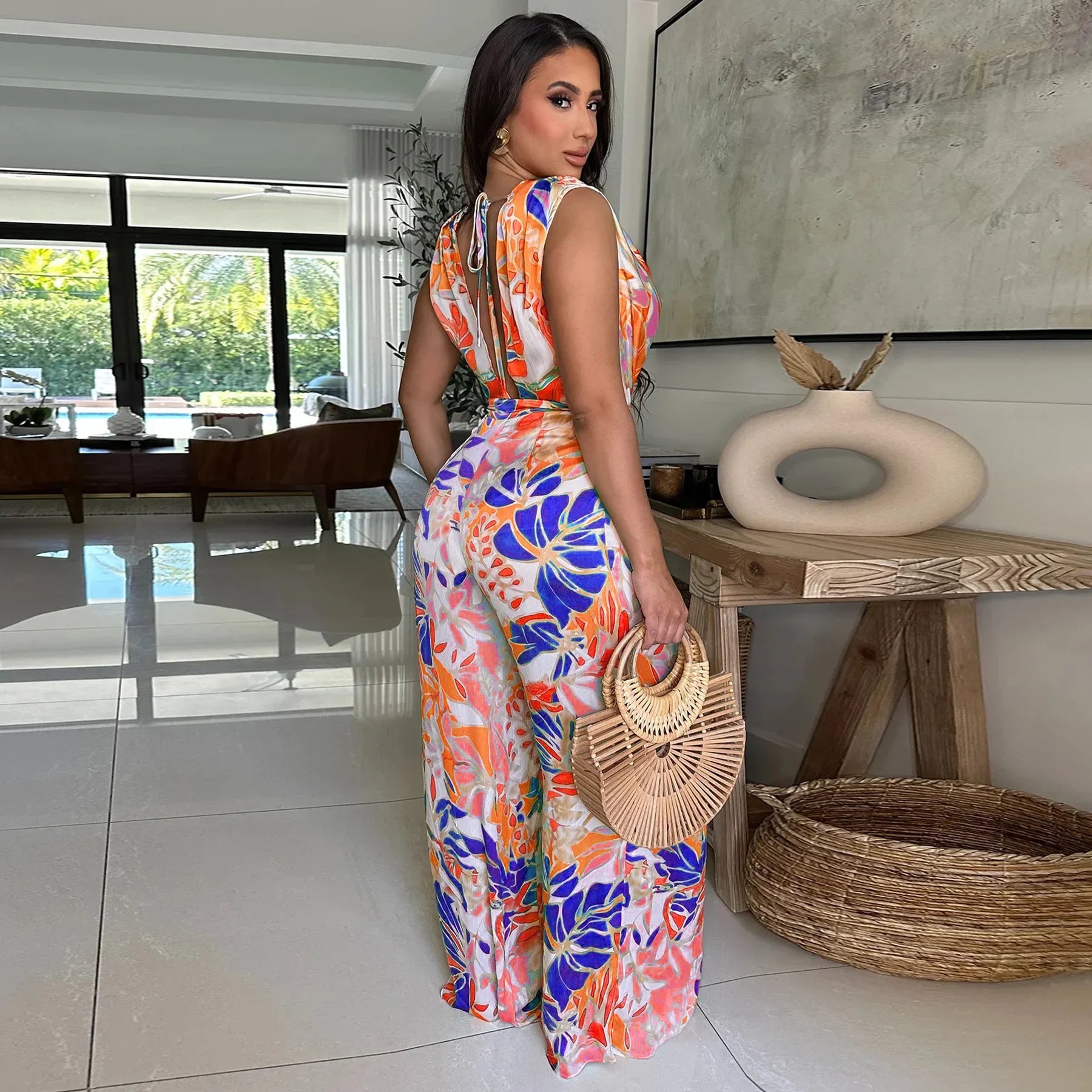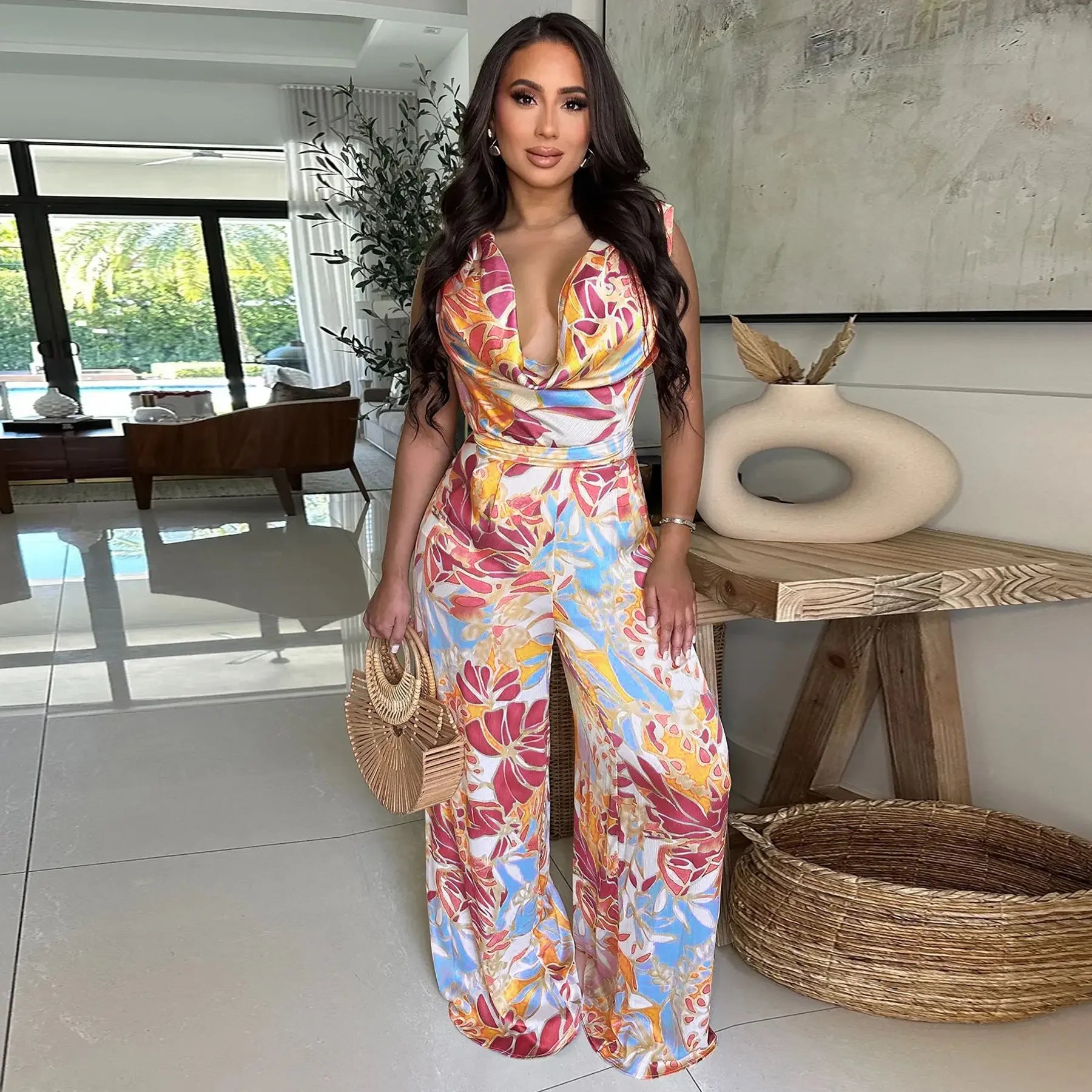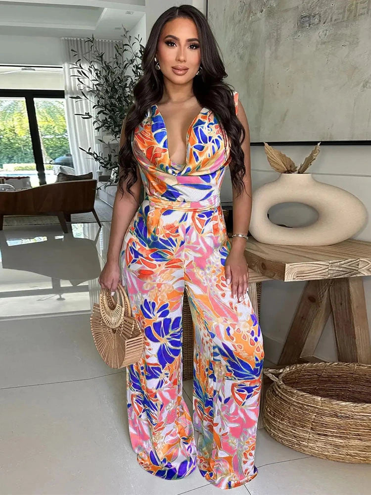 Dieser auffällige Jumpsuit ist perfekt für selbstbewusste Frauen, die eine atemberaubende Silhouette lieben. Der wunderschön drapierte Wasserfallausschnitt und der lebendige, verspielte Druck sorgen für einen atemberaubenden Look aus jedem Blickwinkel.