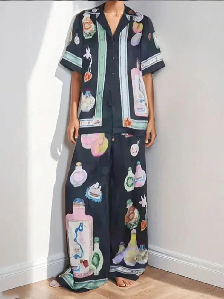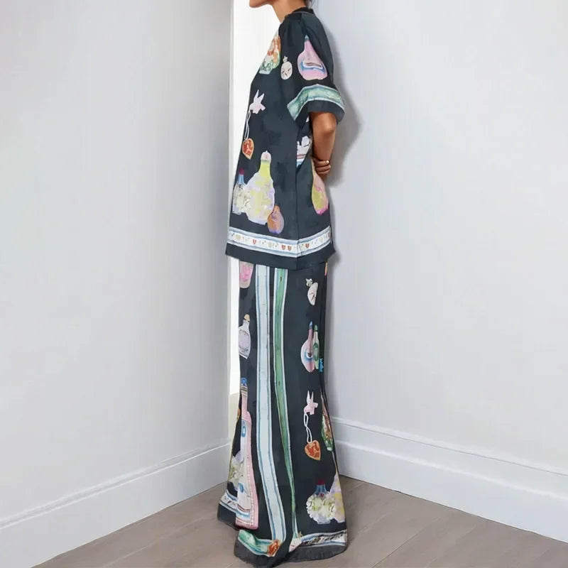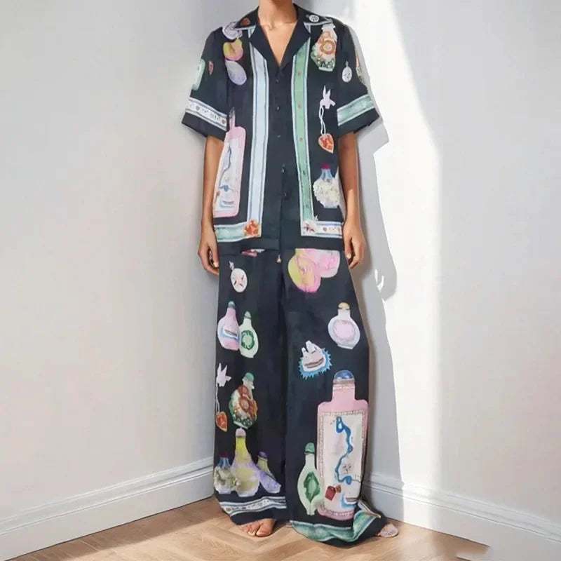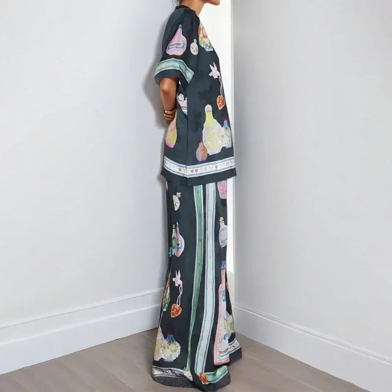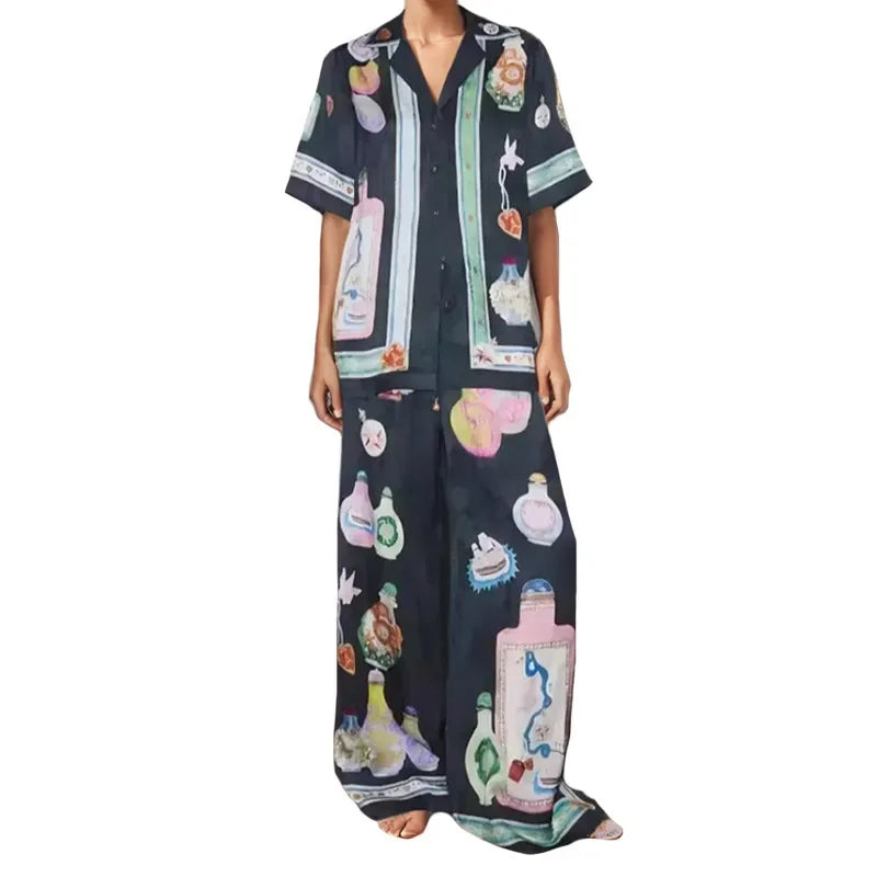 Entdecken Sie die Eleganz einer Pyjama-inspirierten Silhouette, die viel zu stylisch ist, um sie nur zum Faulenzen zu tragen. Dieses atemberaubende zweiteilige Set mit einzigartigem, künstlerischem Druck ist der Inbegriff müheloser Eleganz.