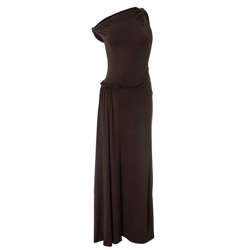 Dieser neue Stil besticht durch ein einzigartiges asymmetrisches Design, das eine moderne, göttinnenhafte Qualität erzeugt. Ein markantes Wasserfall-Schärpendetail an der Hüfte streckt den Körper elegant und bildet starke, schmeichelhafte vertikale Linien.