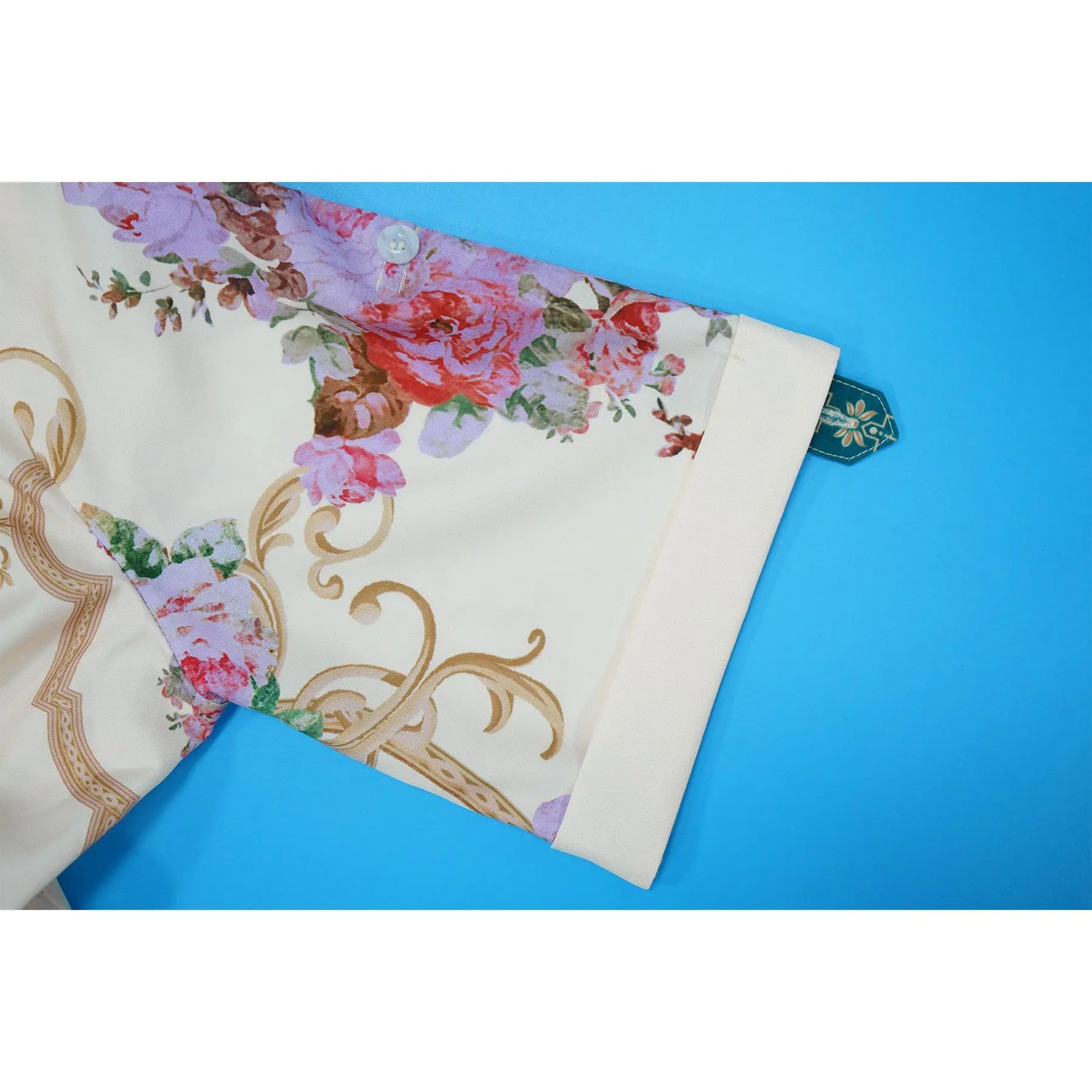 Romantischer Blumendruck: Ein reiches Muster aus Amethyst und Rose, mit einem modernen Touch durch kräftige violette Streifen an den Seiten.