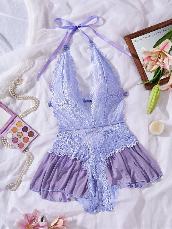 Heizen Sie damit ein sinnlicher Teddy aus floraler Spitze Das Kleid vereint verführerischen Charme mit verspielter Eleganz. Vom gewagten tiefen Ausschnitt über den frechen offenen Rücken bis hin zum flatternden Netzrock ist jedes Detail darauf ausgelegt, zu necken, zu verführen und zu fesseln. Ob Sie eine romantische Überraschung planen oder sich einfach unwiderstehlich fühlen möchten – dieses Stück erweckt Fantasie zum Leben.